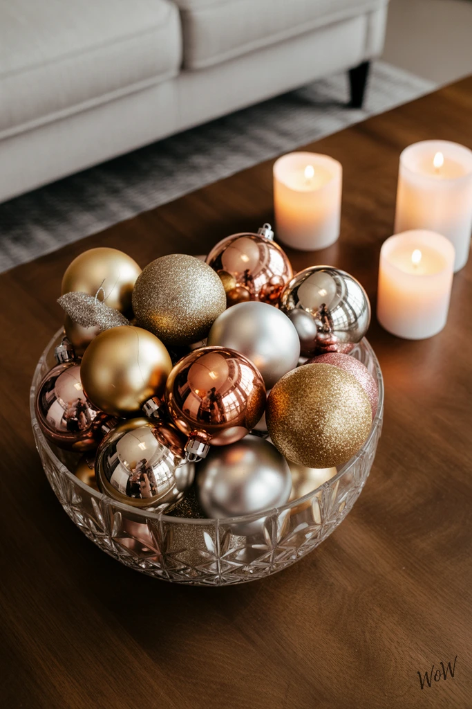 By mixing up the finishes and sizes, you’ll create a rich, layered look that reflects candlelight beautifully. Place the bowl on a dark wooden surface for serious contrast, the gleam of the ornaments pops against the wood, making every detail stand out.
