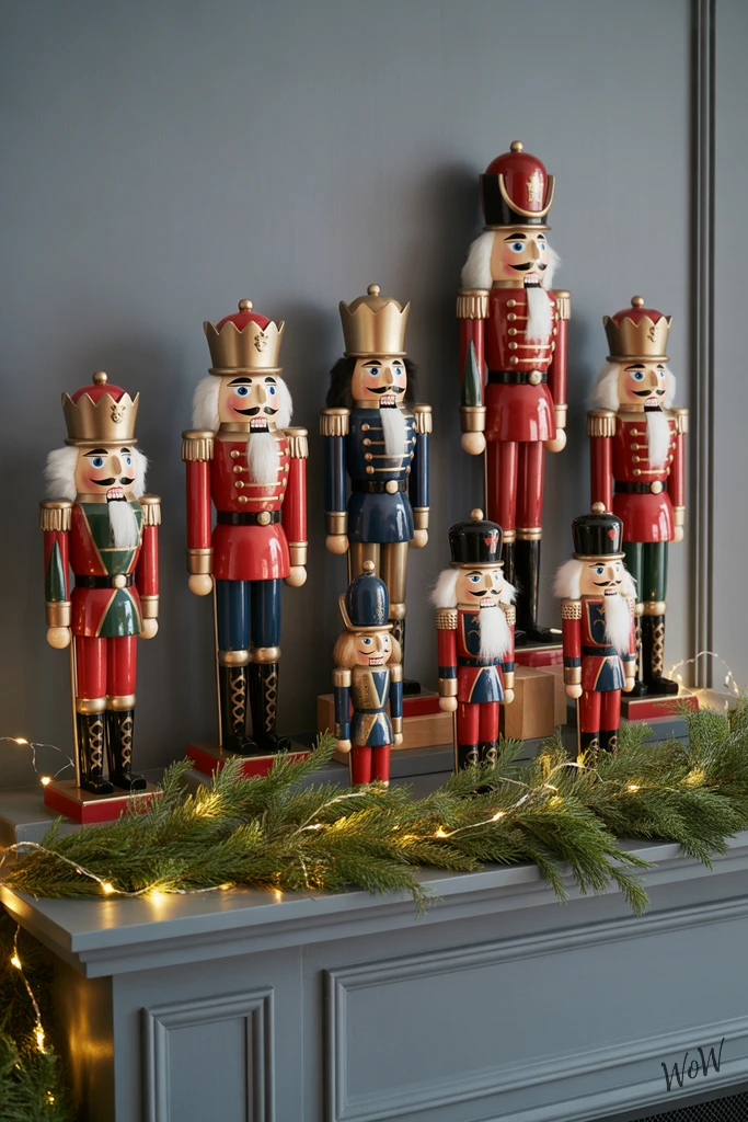 Nestle them into a lush pine garland, which softens their rigid stance and fills out the display. For extra magic, string warm white fairy lights through the greenery; the glow highlights each nutcracker’s intricate details, from painted mustaches to tiny weapons.