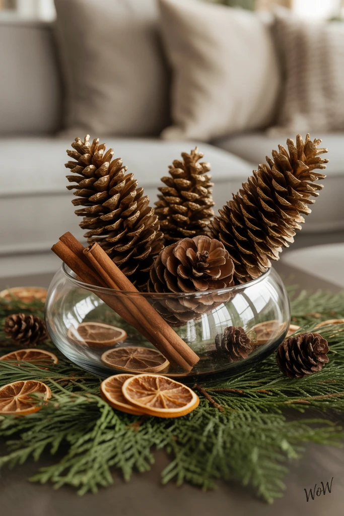 Gather a mix of pinecones (different sizes look best), then give some a festive upgrade by dipping just the tips in gold glitter-this catches the light and adds a luxe touch without losing the rustic vibe. Arrange the pinecones in a wide glass bowl as your centerpiece, layering in cinnamon sticks and dried orange slices for a cozy, aromatic boost.