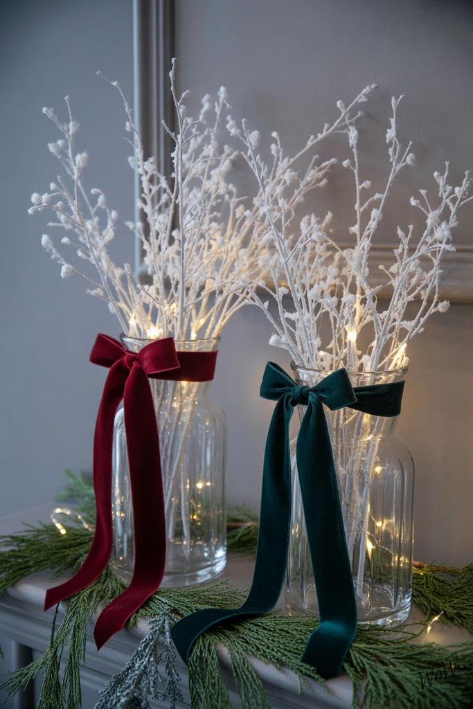 Turn simple glass vases into stunning mantel decor by wrapping them with rich velvet and satin ribbons, think deep crimson and forest green for that holiday pop. Pick ribbons that are at least an inch wide, so they really stand out-wrap them snugly around the center or neck of each vase, then tie big, showy bows.
