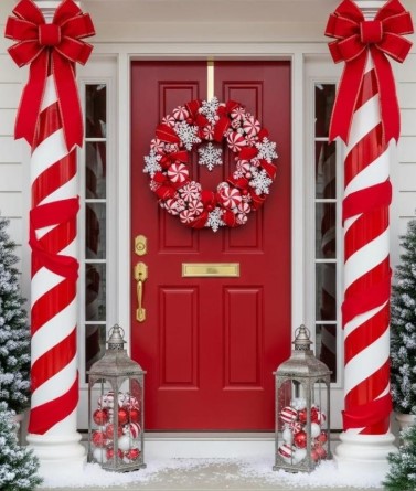 This candy cane-inspired Christmas doorway is a festive showstopper that captures the magic of the season. The bold red-and-white striped pillars instantly grab attention, giving your entrance a sweet, whimsical look straight out of a holiday movie.