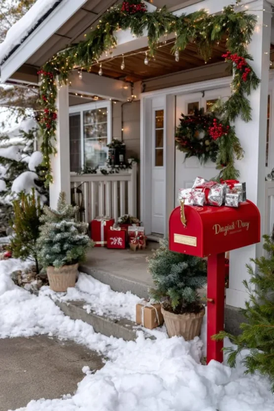 Arranged beside evergreen trees, a lush garland, and a wreath, they tie the whole scene together beautifully. The bright red mailbox overflowing with tiny “Santa deliveries” makes it feel straight out of a Christmas movie.