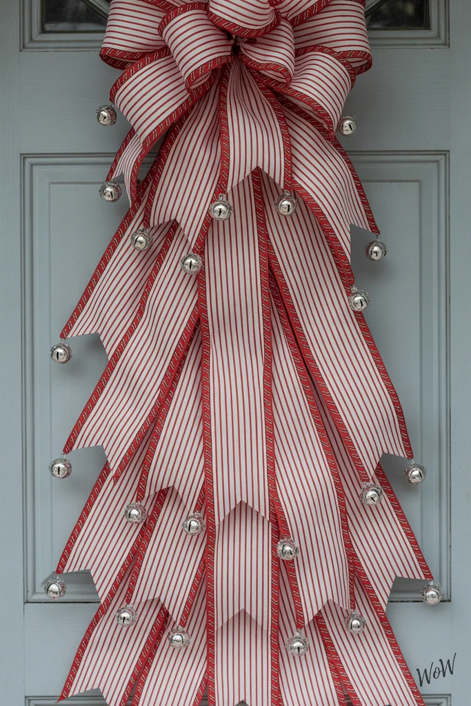 Picture a dramatic, candy cane-inspired ribbon sweeping down your front door-a total showstopper that’s surprisingly easy to pull off. Start by picking a bold red and white striped ribbon, the wider the better for the top of the door.