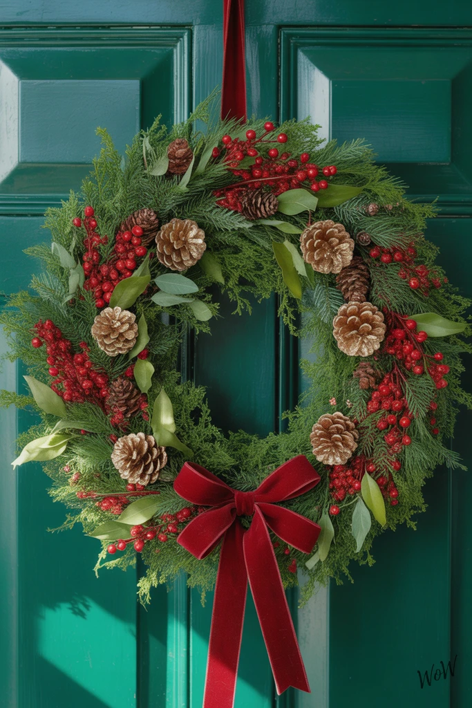 A classic evergreen wreath signals festive cheer, especially when it’s brimming with glossy red berries and gilded pinecones. For this look, pick a full, circular faux or real wreath-fir or pine works well, you want those lush green needles to create a soft, textured base.