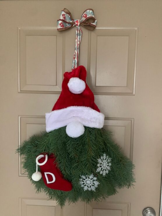 This adorable Santa hat door decoration is a fun and creative twist on the traditional Christmas wreath. Fresh pine branches form the base, giving it a natural, woodsy look and that classic evergreen scent.