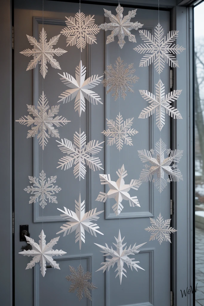 Make your entryway into a frosty fairytale with a cascade of handcrafted paper snowflakes. Start by folding pearlescent or glitter-dusted paper into squares, then snip out geometric patterns-no two snowflakes need to look alike, so get creative with your scissors.