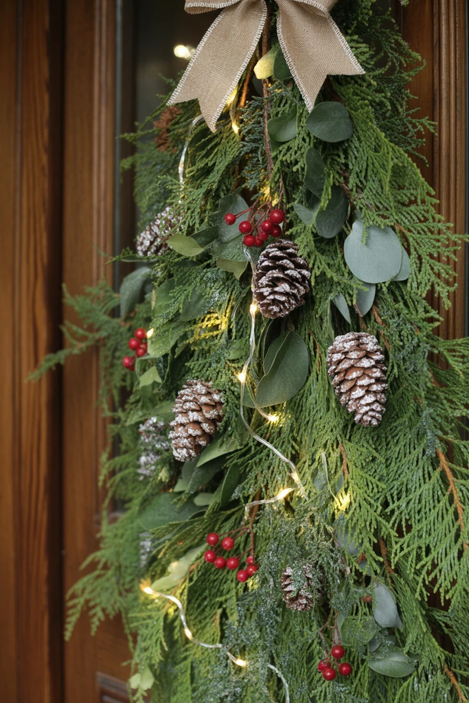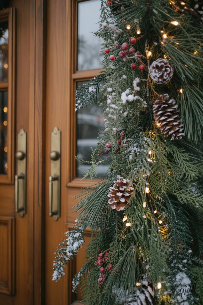 Picture a classic wooden doorway draped in a thick evergreen garland, the kind with soft, deep green needles that look fresh enough to scent the whole porch. Weave in real pinecones-big, chunky ones if you can find them-nestled along the length, along with clusters of bright red berries for a pop of color.