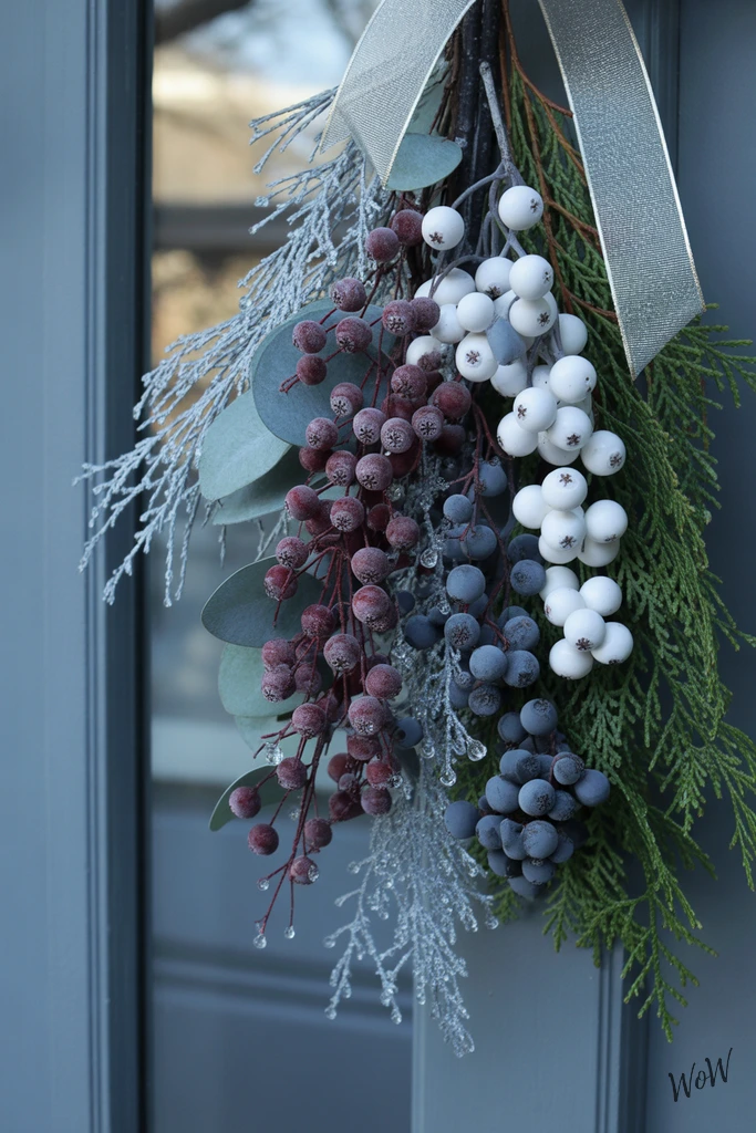 Frosted berry clusters bring a moody, sophisticated vibe to your front door, instantly making it pop against winter’s dull colors. For this look, gather lifelike faux berries in rich burgundy, snowy white, and icy blue-mixing sizes and shades adds a lush, natural effect.