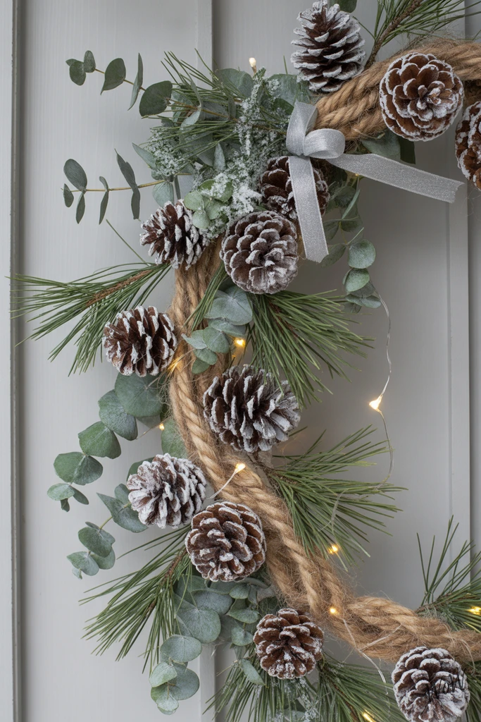 Start with a simple jute-wrapped wreath base-it’s rustic, textured, and gives your door instant winter charm. Arrange pinecones in clusters, mixing big and small ones, so it looks full and a little wild, not too perfect.