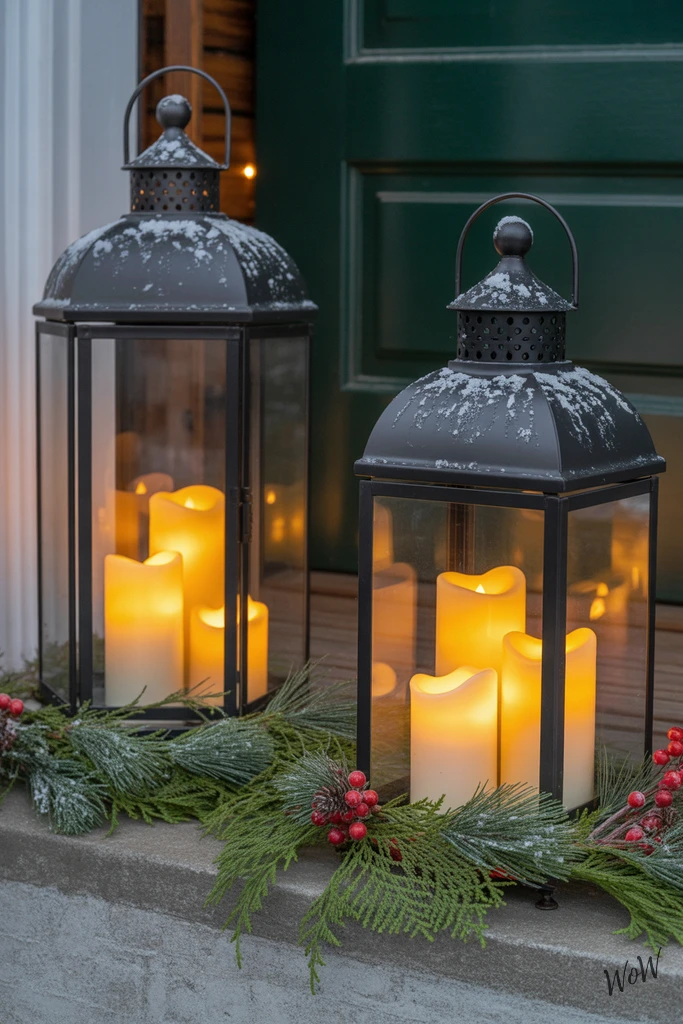 To make the look pop, wrap some faux evergreen sprigs and clusters of red berries around the base of each lantern-this adds a fresh, Christmassy touch without much effort. For even more wintery charm, sprinkle a dusting of fake snow on top of the lanterns, it’s a simple detail that makes everything feel magical.