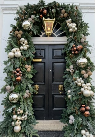 This elegant Christmas doorway is the perfect blend of sophistication and festive charm. The lush green garland, draped gracefully around the door, creates a stunning natural frame, while the mix of bronze, gold, and champagne ornaments adds a touch of refined sparkle.