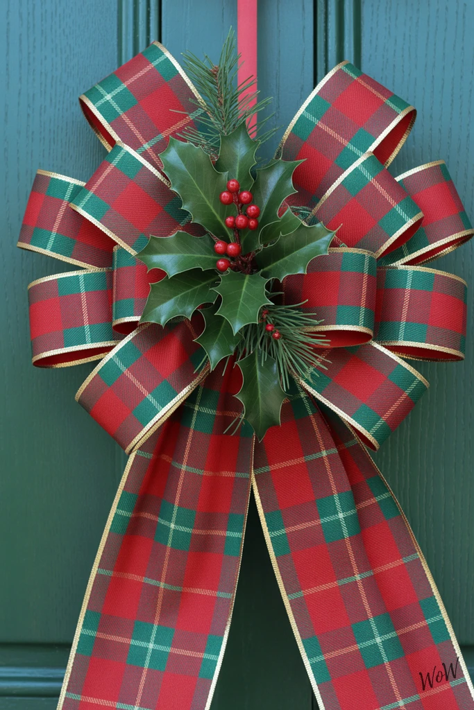 Create multiple generous loops and fluff them out so the bow looks full and dimensional, then tuck sprigs of artificial holly right in the center. The glossy green leaves and bright red berries pop against the plaid, adding an instant festive touch.