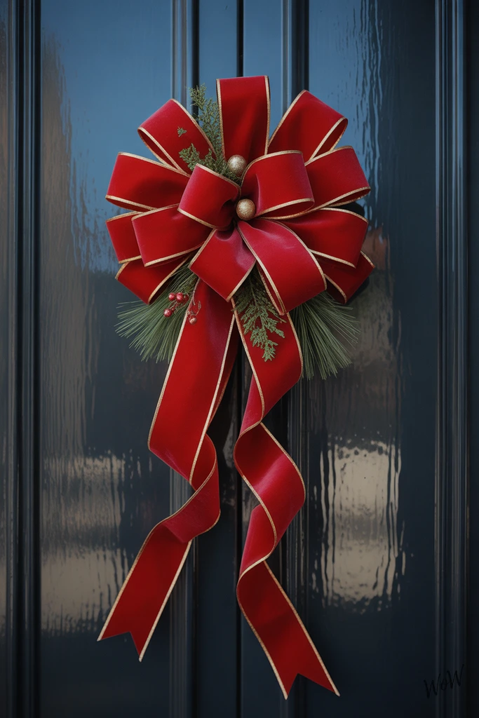 A showstopping red velvet ribbon bow turns your front door into a statement of holiday luxe. Picture this: a glossy black door, dressed with a wide, plush velvet bow in deep crimson, its loops large and inviting, tails spilling gracefully toward the ground.