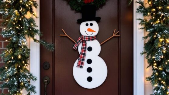 The snowman’s friendly smile instantly brightens the space, while the garland of greenery and twinkling lights framing the doorway adds warmth and sparkle. It’s a fun, family-friendly decoration that’s easy to create and perfect for both kids and guests to enjoy.