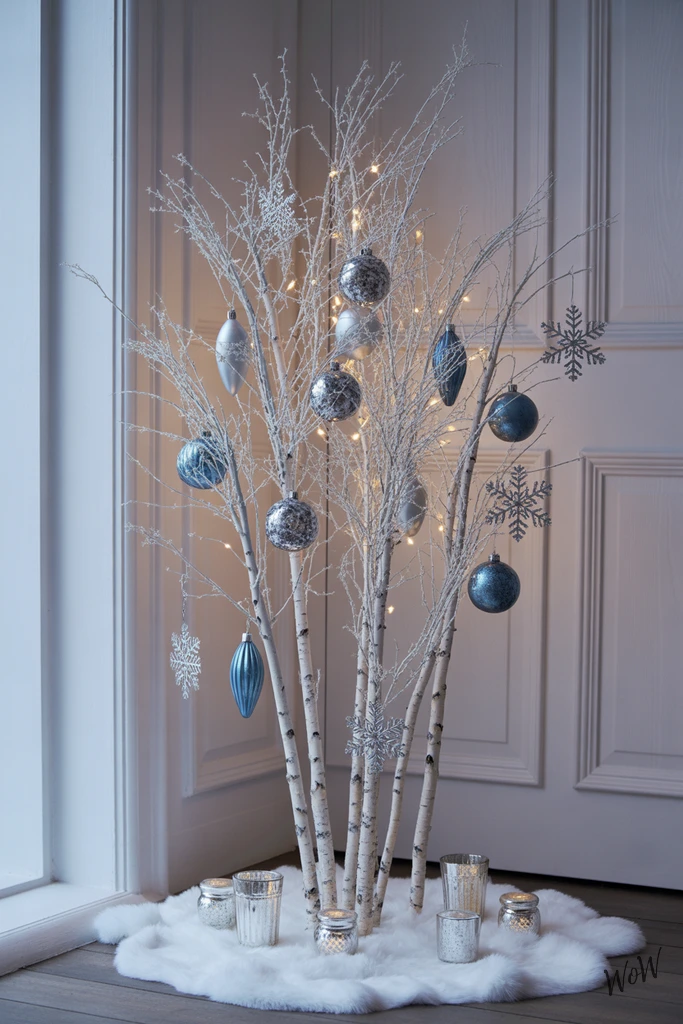Create an enchanting winter entryway by grouping white-painted birch branches upright in a tall, sturdy vase or basket right by your door. Hang vintage glass ornaments-think shimmering silvers, icy blues, and sparkling crystal-for a nostalgic, frosty vibe.