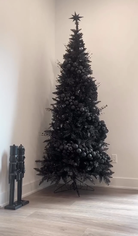 The black nutcracker standing guard nearby enhances the edgy, sophisticated aesthetic. It feels minimalist yet impactful, a little gothic, and definitely a unique statement piece that gives the classic Christmas tree a totally fresh and avant-garde makeover.