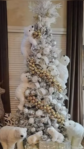 What makes it unique is the addition of charming, plush polar bears clinging to the branches, giving the whole scene a delightful, snowy habitat feel. It feels magnificent, glamorous, and wonderfully festive, transforming the living room into a sophisticated arctic wonderland that is perfect for anyone who loves high drama and a touch of whimsy in their holiday decor.