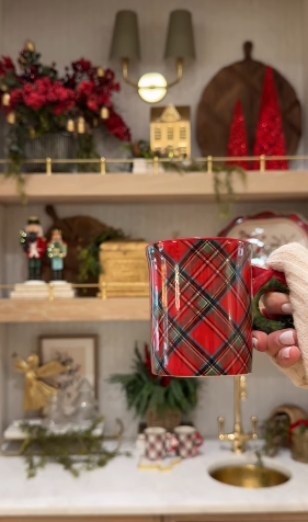 The addition of charming miniature nutcrackers and a sweet little holiday house instantly gives it that nostalgic, busy Christmas market feel. It’s cozy, detail-oriented, and perfect for adding festive touches that feel personal and inviting, especially when you’re sipping from that perfect plaid mug!