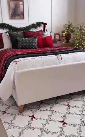 It acts as the perfect, soft foundation for a cozy Christmas scene, complementing the rich red and green bedding (or sofa pillows in a living room) beautifully. It feels fresh, detailed, and wonderfully inviting.