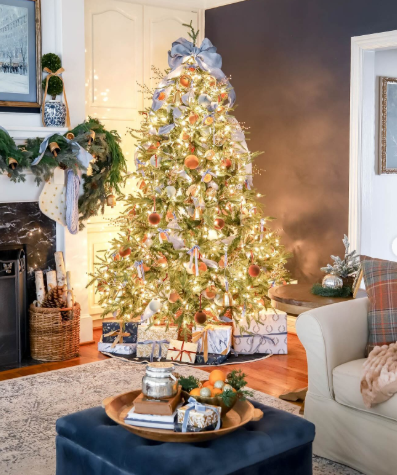 This idea delivers a look that is both luxurious and unexpectedly fresh by blending cool and warm tones. The Christmas tree is the star, wrapped in warm, glowing lights and decorated with beautiful ornaments in soft silvery-blue and rustic, earthy orange even whole dried oranges, adding a lovely natural texture.