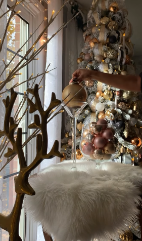 The tall, elegant glass creates height and drama, while the plush white faux fur base makes everything feel cozy and expensive. With the glittering tree in the background and the metallic reindeer accent, it feels sophisticated, high-end, and perfectly festive; proof that a little creativity can go a long way!