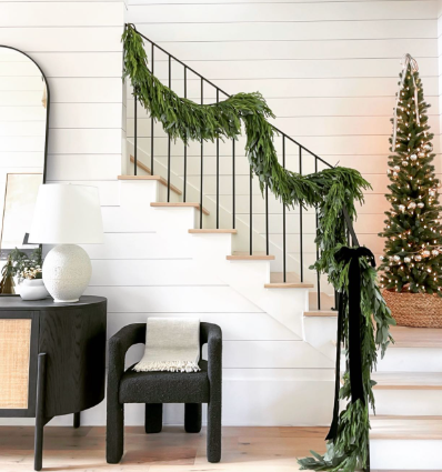 Against the crisp white shiplap walls and light wood stairs, the deep green foliage really pops. The addition of a sleek black velvet ribbon adds a quiet, upscale texture. It feels sophisticated, slightly minimalist, and relies on natural texture and contrast for a chic, beautifully understated holiday welcome.