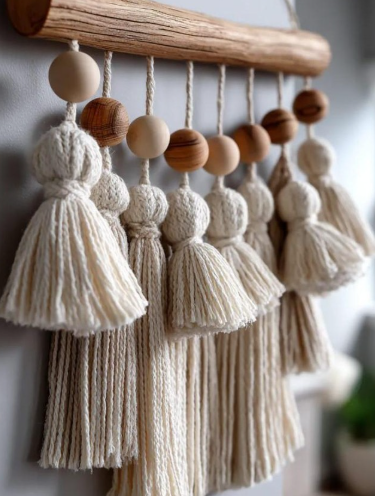 This idea introduces a beautiful Bohemian-inspired warmth and soft texture to the living room decor. It moves away from overt Christmas symbols and focuses on creating a cozy, hygge atmosphere. The macrame tassels, made of creamy natural yarn, hang from a rustic wood branch and are accented with smooth wooden beads in different tones.
