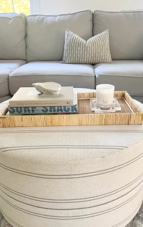 This idea is all about relaxed style and practical elegance by using a soft ottoman as a coffee table. The look is immediately casual and comfortable, with a neutral striped fabric on the ottoman and a light gray sofa.