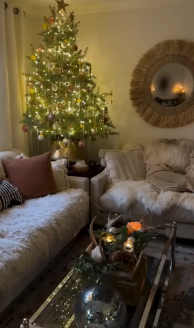The tree is decorated with a mix of warm white lights and colorful, eclectic ornaments that suit the relaxed, textured vibe of the room. With plush faux-fur throws on the seating and a natural centerpiece on the coffee table, the atmosphere is incredibly inviting, soft, and beautifully intimate- ideal for a charming, unfussy Christmas.