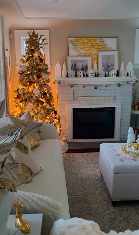 This dreamy living room feels like stepping straight into a cozy Christmas postcard. Soft golden lights from the beautifully decorated tree glow across the room, giving everything a warm, inviting vibe. The white fireplace, topped with cute mini houses and winter artwork, adds a charming, storybook touch.