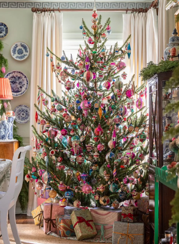 This tinsel-free Christmas tree has a wonderfully nostalgic, almost storybook charm. Instead of shiny strands, the tree is packed with colorful vintage-style ornaments that make it feel warm, cheerful, and full of personality. The mix of pinks, blues, and golds gives the whole room a playful, collected-over-time vibe.