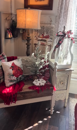 This rustic living room setup brings a nostalgic, old-time Christmas charm that feels instantly comforting. The warm lamp glow, cozy plaid accents, and cardinal-themed pillow create that classic holiday warmth you’d find in a vintage postcard. The little frosted tree, wooden bench, and handmade-style décor pieces make the space feel personal and homey, like a room filled with family traditions.