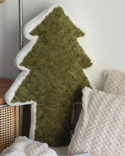 This Christmas throw pillow brings a fun, cozy twist to holiday décor. Its fluffy tree shape instantly adds a playful, festive touch without feeling over-the-top. The soft textures and warm green tones blend perfectly with neutral blankets and pillows, creating a relaxed, snuggly vibe in the living room.