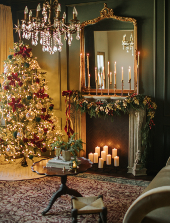 Above the marble fireplace, a magnificent gold mirror and a candelabra cast a soft, flickering glow that highlights the lush, evergreen garland. It feels romantic, a little bit mysterious, and incredibly festive which is perfect for a sophisticated holiday celebration over the winter months. It’s truly a high-end, timeless Christmas setting.