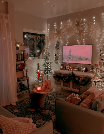 You’ve got little trees adding pops of festive cheer, and those gorgeous paper snowflakes on the wall really elevate the winter wonderland feel. Even the TV screen shows a snowy scene, pulling the whole look together. It’s the perfect setting for snuggling up with a hot chocolate, watching holiday movies, and just soaking in all the serene, warm Christmas vibes.