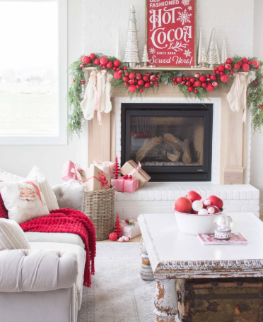 This look is pure farmhouse chic meets classic Christmas! It feels incredibly bright, fresh, and friendly, focusing on a clean white palette punctuated by cheerful, vibrant pops of red. The fireplace is the star, decked out with a lush garland layered with bright red berries, mini knit stockings, and a fun “Hot Cocoa” sign that instantly makes you feel warm.