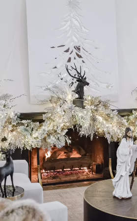 This look embraces icy elegance and modern sophistication for a true winter wonderland feel. It swaps traditional red and green for a palette of crisp white, silver, and pale gold. The fireplace becomes a dazzling focal point with an oversized, bleached garland and shimmering white lights that look like fresh snow.