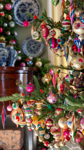 The look feels wonderfully maximalist and cozy, blending beautifully with traditional home decor like classic wood furniture and delicate blue-and-white porcelain plates. It’s an atmosphere that’s delightfully busy, personal, and full of the warm, sentimental spirit of Christmases past.