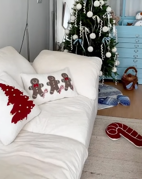 The simple green tree in the background is decorated with white ornaments and soft blue ribbons, keeping the whole look light and modern. It feels fun, comfortable, and perfect for families, giving a little nod to Christmas treats without overwhelming the clean, casual aesthetic of the room.