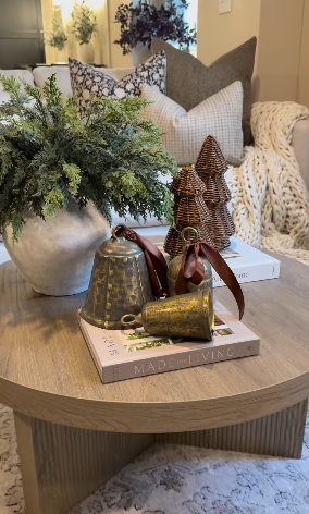 This look captures a feeling of rustic elegance and natural warmth. The decor is focused on rich textures and a neutral color palette, making it feel very high-end and cozy. The centerpiece is the coffee table, featuring chunky, antiqued brass bells with satin brown ribbons, nestled alongside woven wicker Christmas trees and a simple white vase holding fresh evergreen stems.