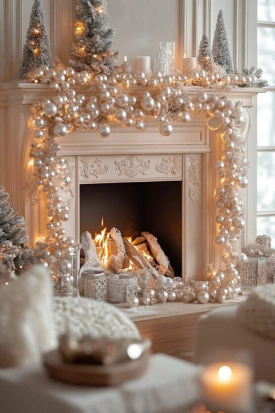 You’ll get this dreamy, floating effect that looks way more impressive than the effort it takes. Keep the rest of your setup simple: drape a crisp white fabric across the mantel, cluster clear vases filled with shiny silver ornaments, and add a few chunky white pillar candles on mercury glass holders.