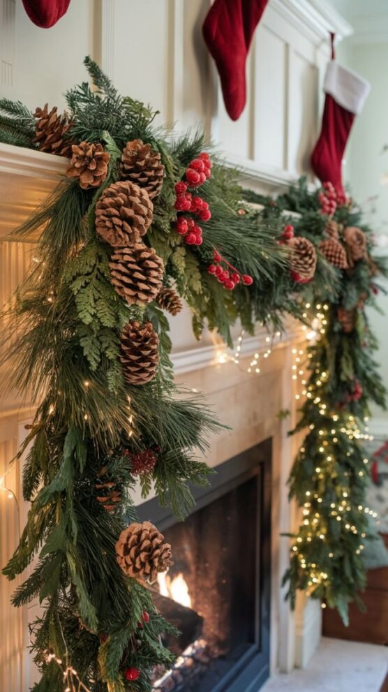 Add golden pinecones and sprigs of bright berries to fill out the wreath, making sure the textures and colors feel balanced. For the garland, match the vibe: drape it across the mantel, weaving in similar ornaments, bows, and pinecones.