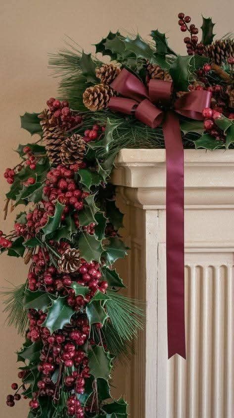 For the holly berries, pick up some realistic faux ones (they’re everywhere during the holidays), and tuck little clusters in-between the garland and ribbon, you don’t need a ton-just enough to make the red details stand out against the green. The trick is to layer things casually so it looks effortless, not too perfect, and if you’ve got a few holly leaves, mix those in too for extra texture.