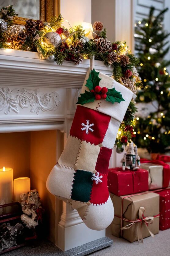 Felt Christmas stockings are a classic DIY win-they’re easy to make, super customizable, and perfect for adding a cozy, handmade vibe to your mantel. Start with colorful sheets of felt (think deep reds, forest greens, snowy white), and cut two stocking shapes for each one you want to hang.