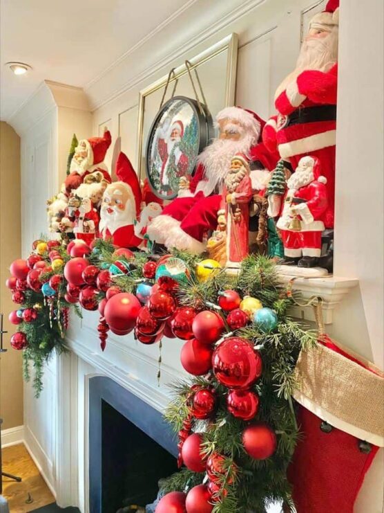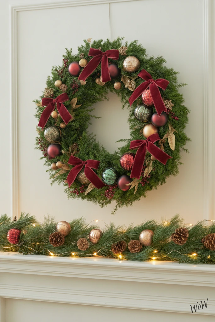 Start with a lush evergreen wreath as your mantel’s showstopper, centering it above the fireplace for instant holiday charm. Layer in plush burgundy velvet bows (they’re super luxe and look rich against the greenery), then tuck in vintage glass ornaments in jewel tones-think emerald, sapphire, and ruby-for a pop of color and a little throwback sparkle.