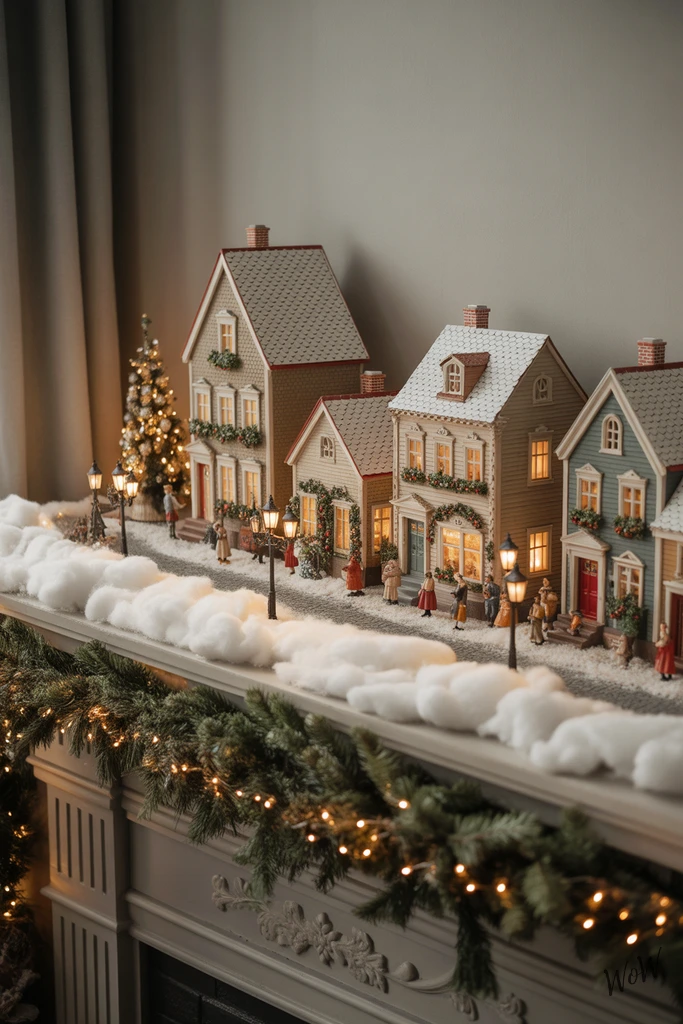 Building a Christmas village on your mantel instantly turns your living room into a scene straight out of a holiday storybook. Start by spreading a layer of cotton batting or faux snow across the mantel-this is your snowy base.