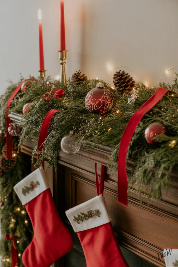 Tie on velvet red ribbons (big bows or just simple knots, your call), and let the tails hang for extra drama. For the finishing touch, hang classic red stockings underneath-bonus points if you add embroidered name tags, it makes everyone feel special.