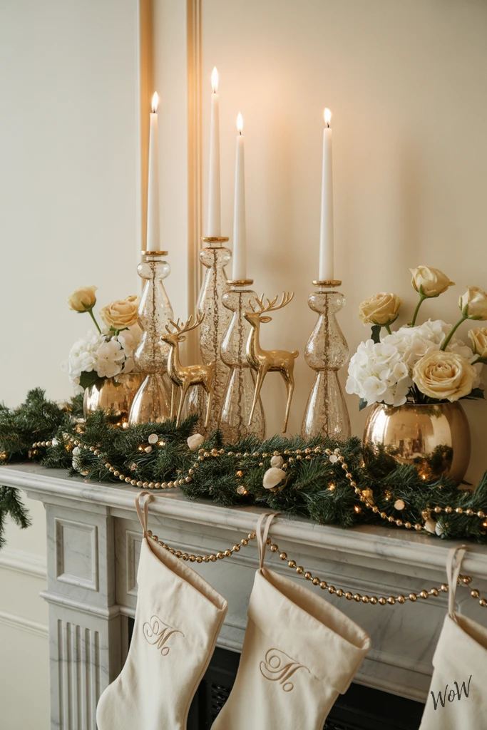 Nestle some white hydrangeas and champagne roses into gold-rimmed vases or ceramic vessels; the vibe is lush but not fussy. For a playful-yet-polished touch, tuck in some gold reindeer figurines between the florals and candles, it’s subtle but festive.