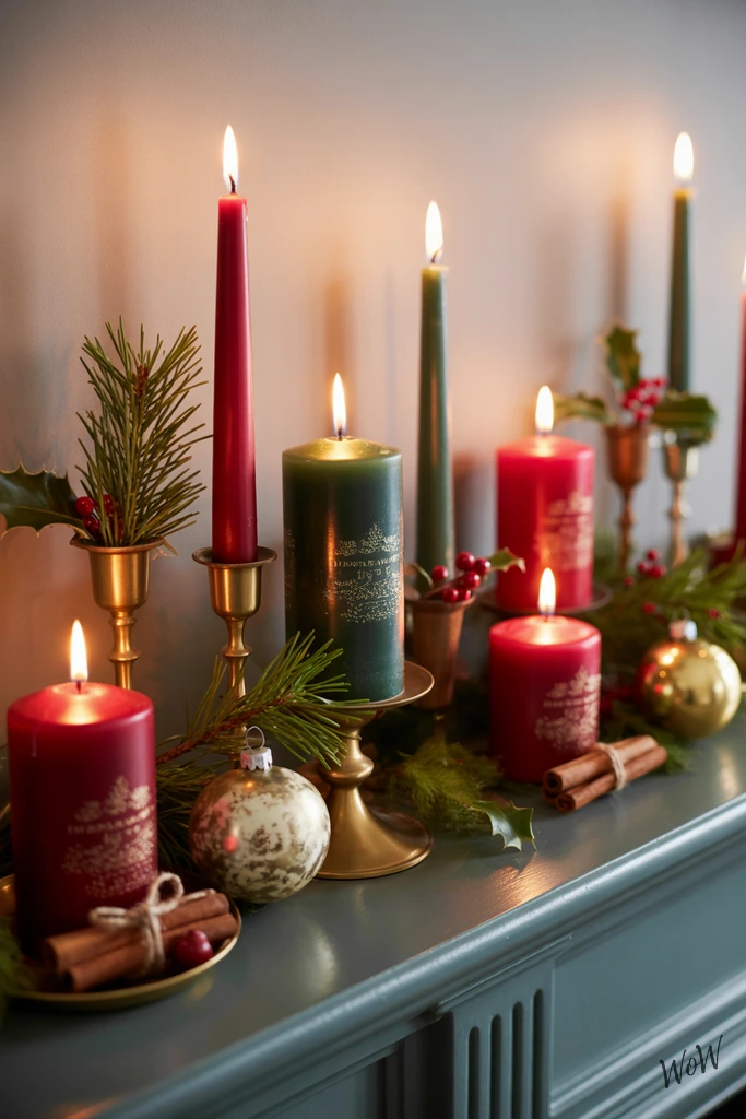 Here’s a little trick: tie some cinnamon sticks with twine around the candle bases-not only does it look charming, but it’ll add a cozy holiday scent as the candles warm up. Scatter a few antique mercury glass ornaments around to catch and reflect the candlelight, filling your whole mantel with a warm amber glow.