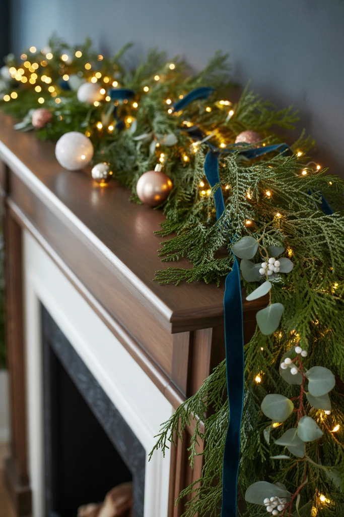 Finally, tie deep blue velvet ribbons at each end, letting the tails cascade down-this is your secret weapon for a luxe, finished vibe. Plug in the lights, turn off the overheads, and watch your mantel become the coziest spot in the house.